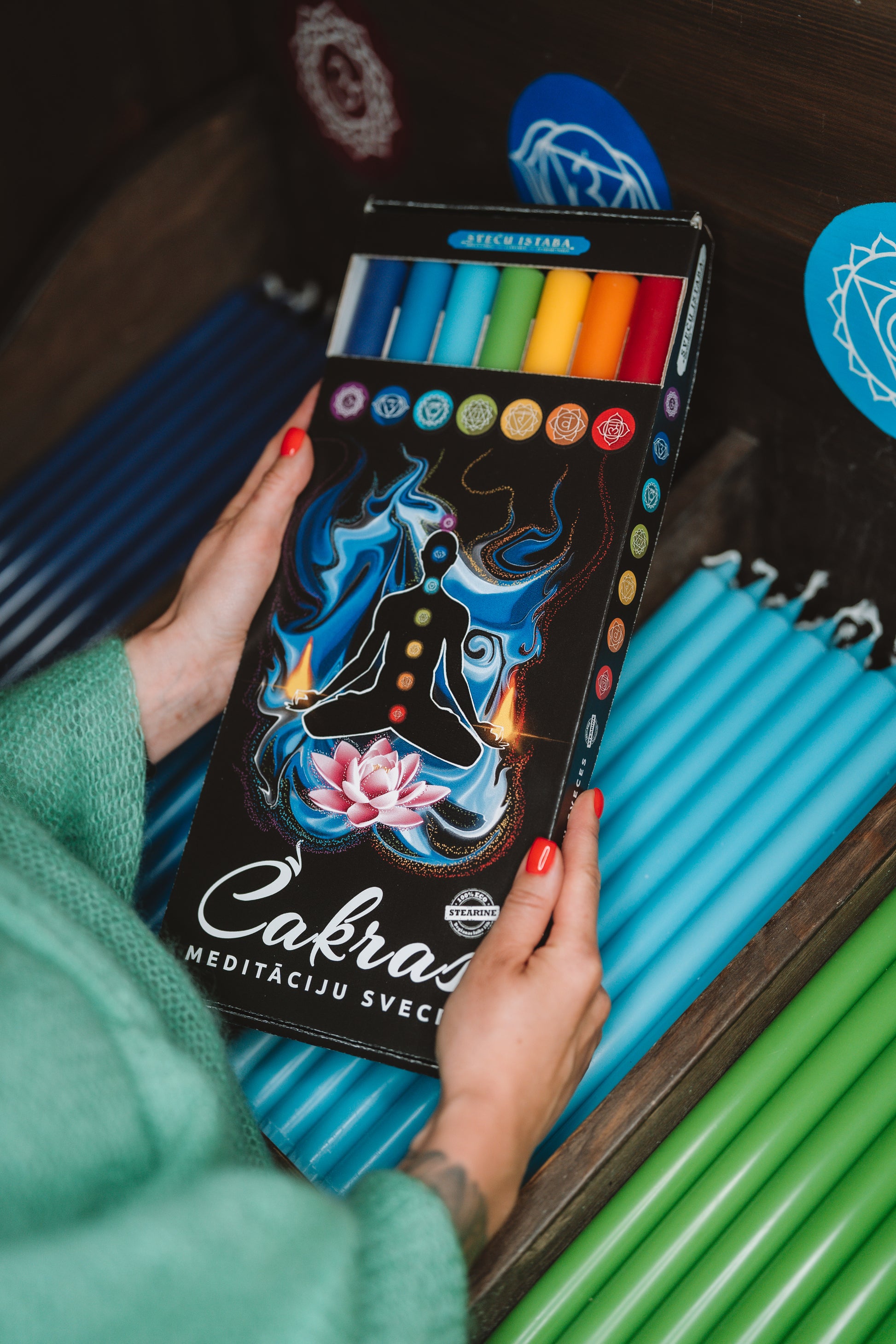 A set of long chakra table candles made in Latvia, which contains all seven chakra colored candles: