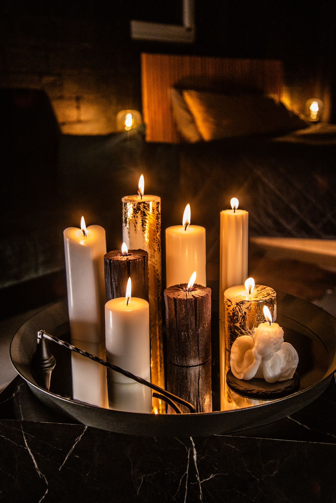 Eco stearin collection and design candle set, which includes the following candles, and a stainless steel candle extinguisher as a free additional gift: