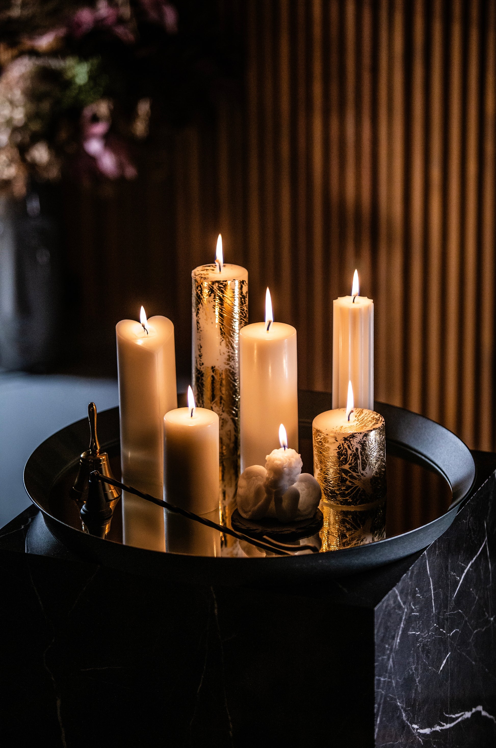 Before each burning, trim the wick of the candle. Use a tray or candle holder for burning the candles. Do not burn them in a drafty room or in closed containers. Observe larger gaps between individual candles, when using them in a composition.