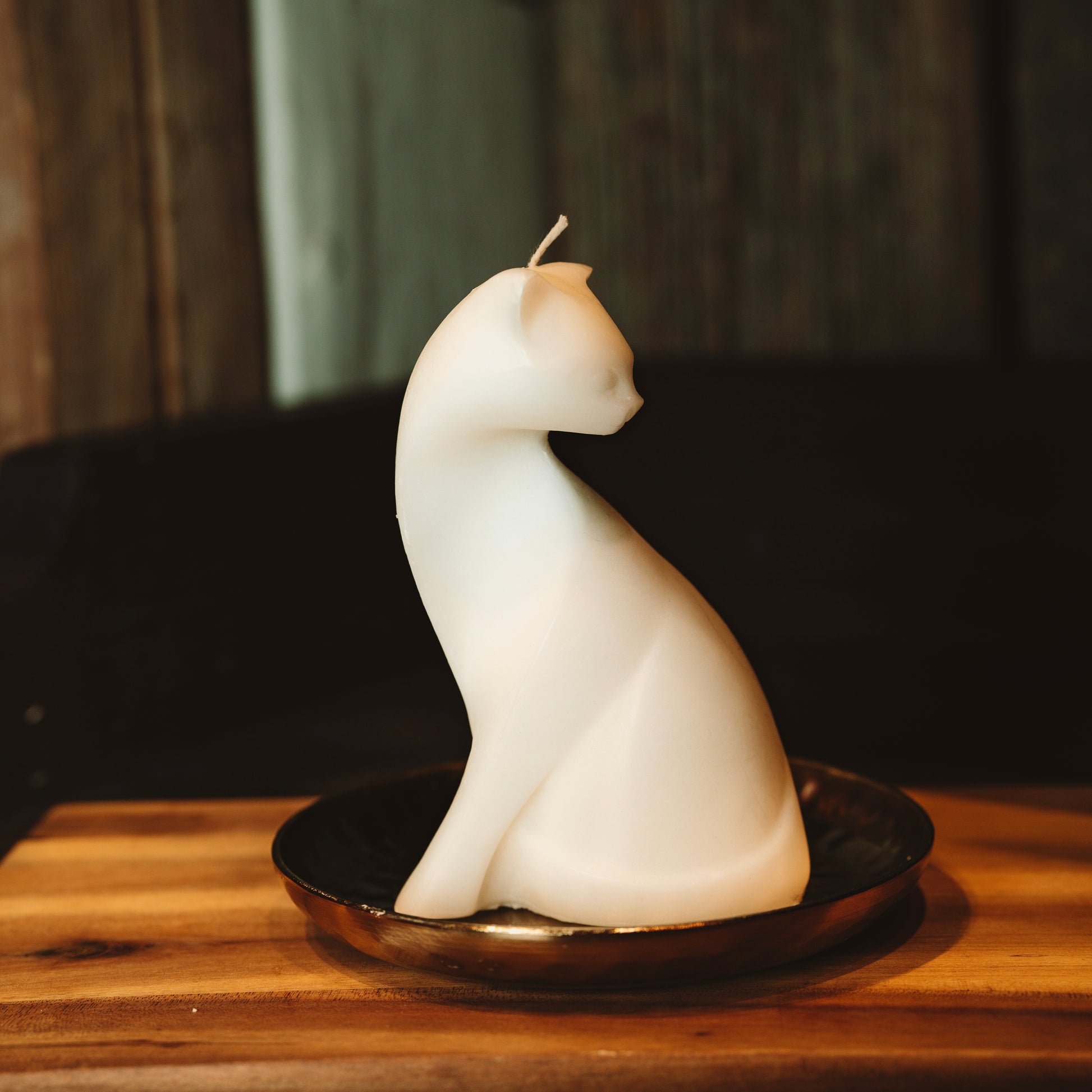 White, black or gold colored decorative figure candle in the shape of a cat. The candle was cast at a temperature of 75° - 80° C, from eco stearin, which is an ecologically clean product and is obtained from natural vegetable oil. Stearin candles have a smooth surface and can have a slightly matte or glossy surface.