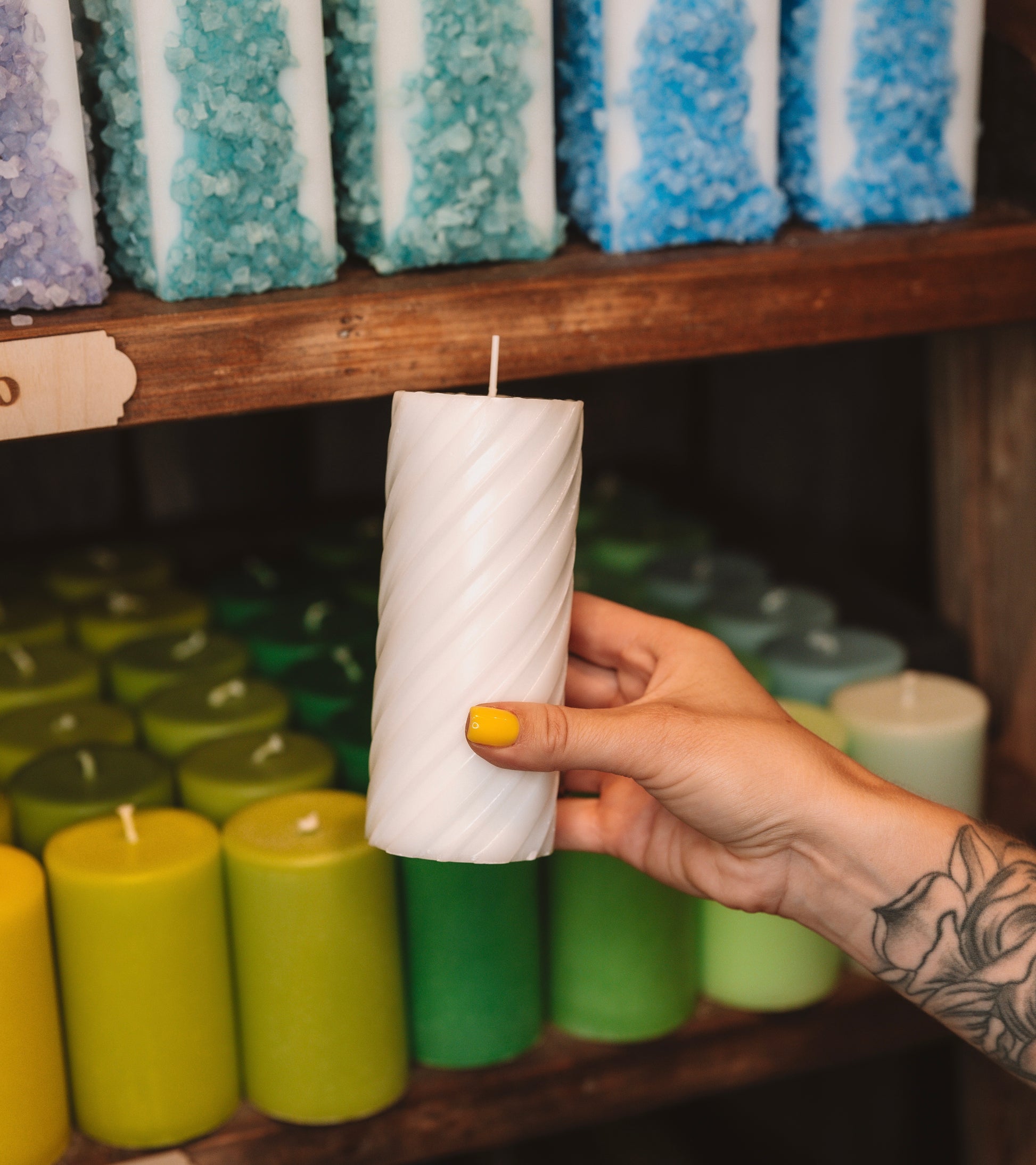 A white eco stearin candle in the form of a cylinder. Stearin candles are an ecological and natural product that stands out for its production process and biodegradable composition. Stearin is obtained from vegetable oils, ensures longer and cleaner burning, compared to other candles.
