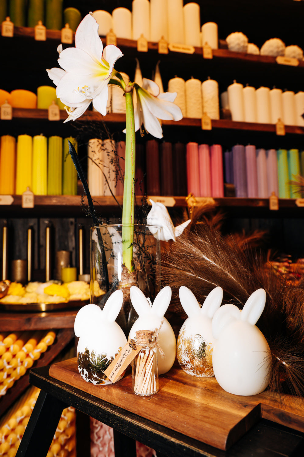 Eko stearīna kolekcijas sveču komplekts, kurā ietilpst četras dažādas zaķu sveces .