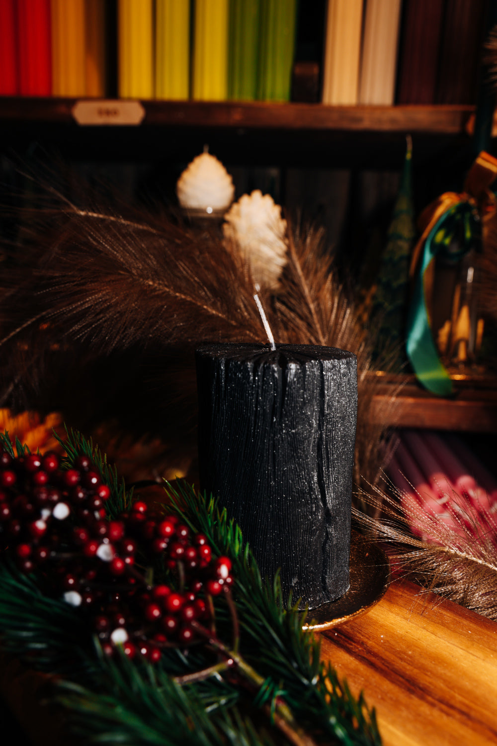 Melnas krāsas dekoratīvā dizaina svece kokogles formā, kas lieliski iederēsies un papildinās jebkuras telpas interjeru.