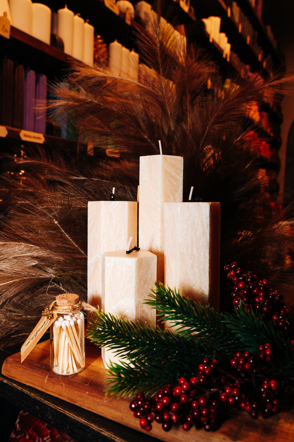 Elegants bēšā toņa kristālstearīna sveču komplekts, ideāli piemērots Adventes vainagam.