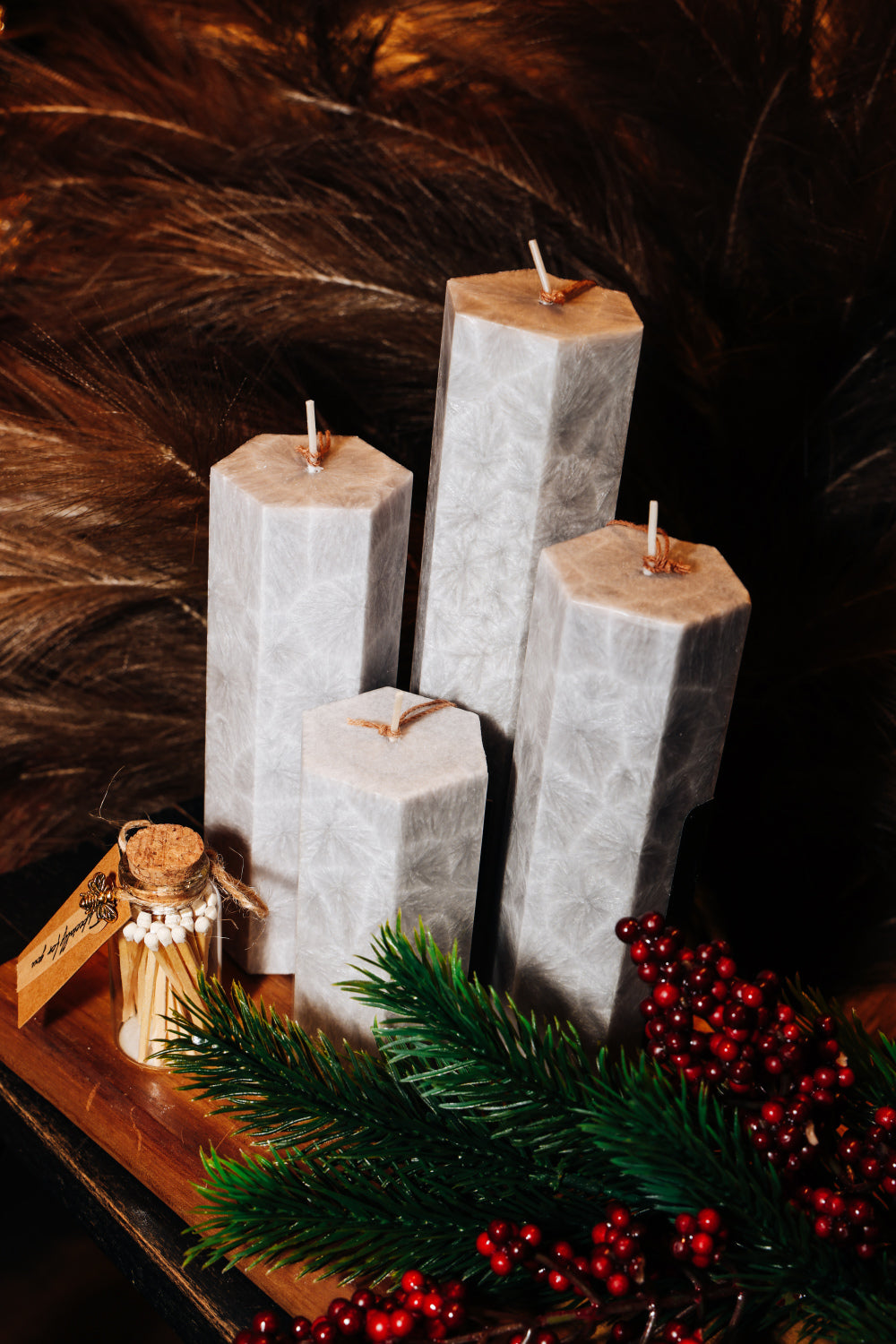 Elegants eko sveču komplekts, radīts tieši Adventes vainagam. Sveces ražotas Latvijā un izceļas ar maigu, dabisku izskatu un unikālu īpašību — degšanas laikā veidojas smalka mežģīņu sieniņa, kas Adventes laikā piešķir īpaši siltu un mājīgu gaismu.