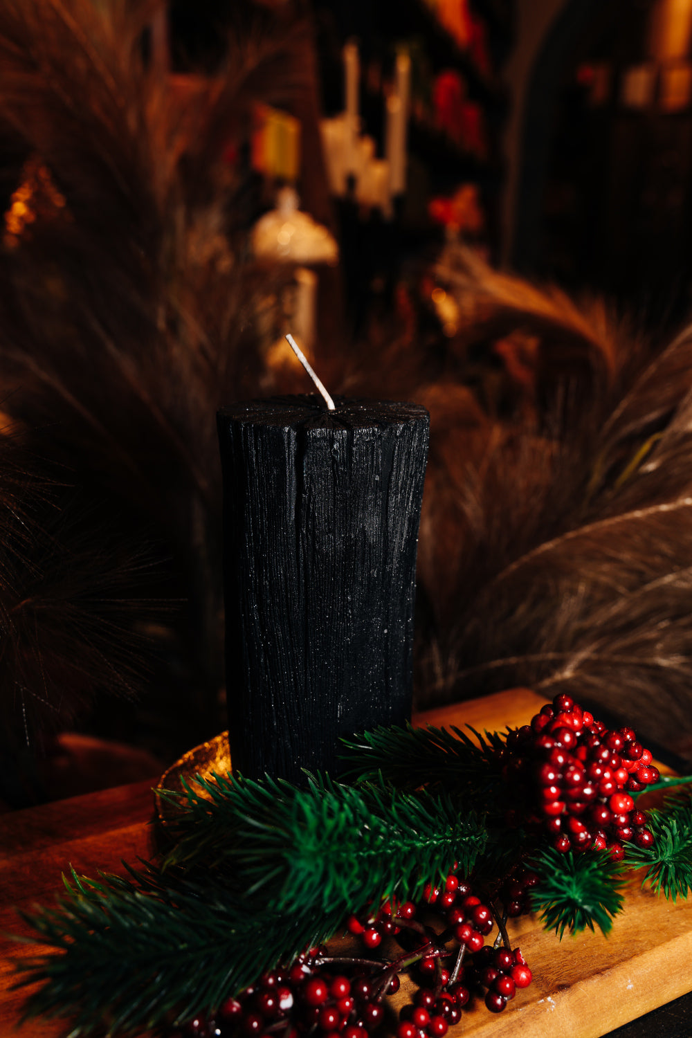 Melnas krāsas dekoratīvā dizaina svece kokogles formā, kas lieliski iederēsies un papildinās jebkuras telpas interjeru.