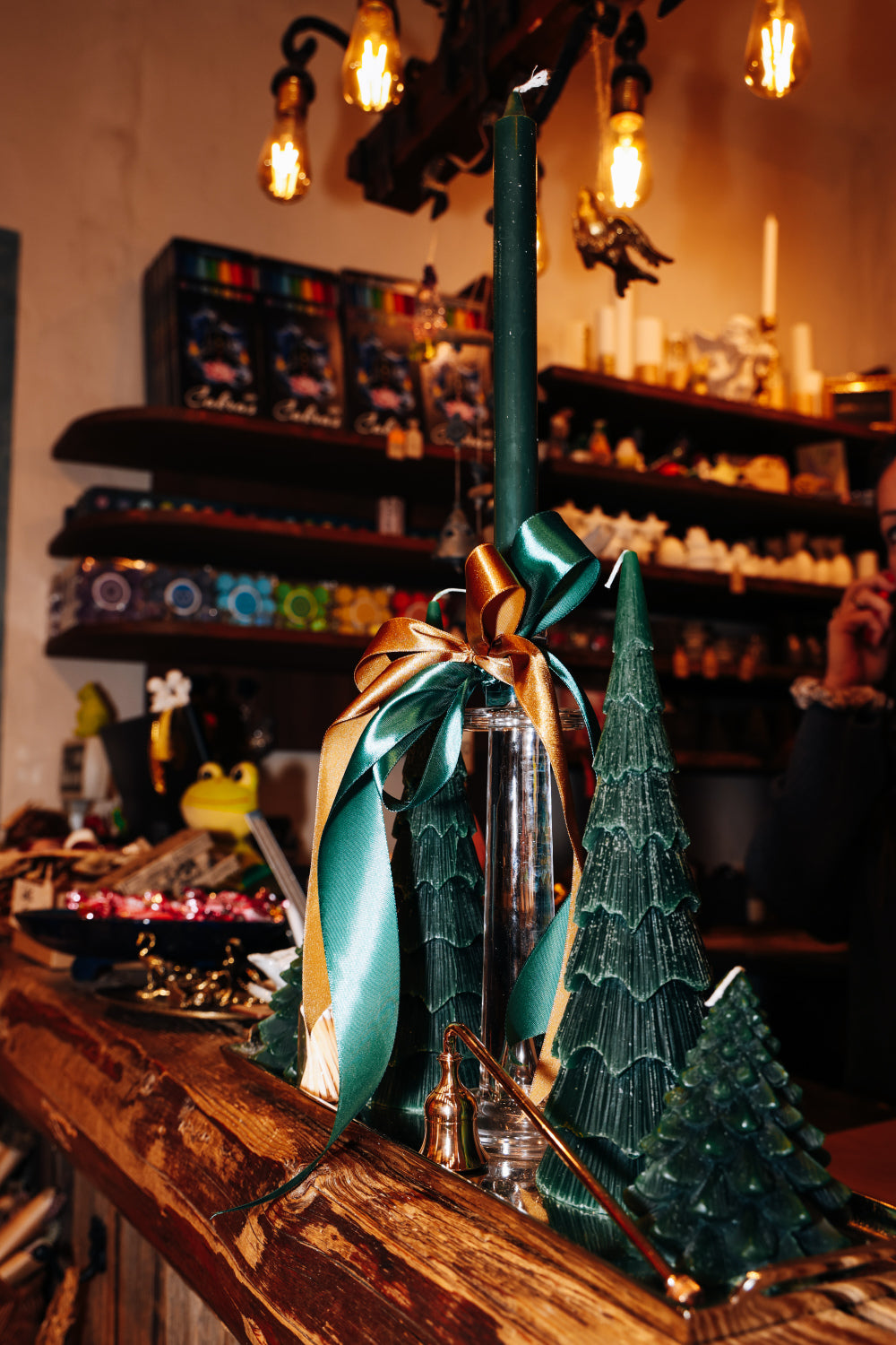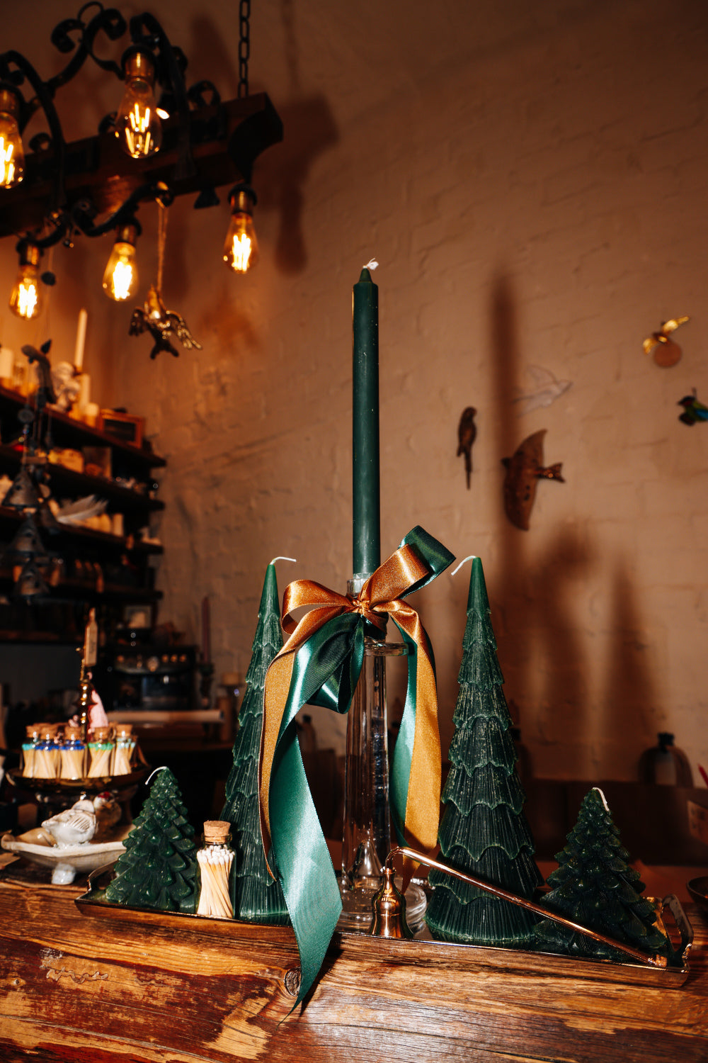 Tumši zaļa svētku svece, kas veido komplekta centrālo akcentu. -