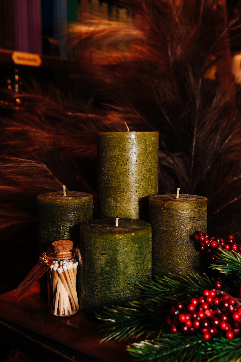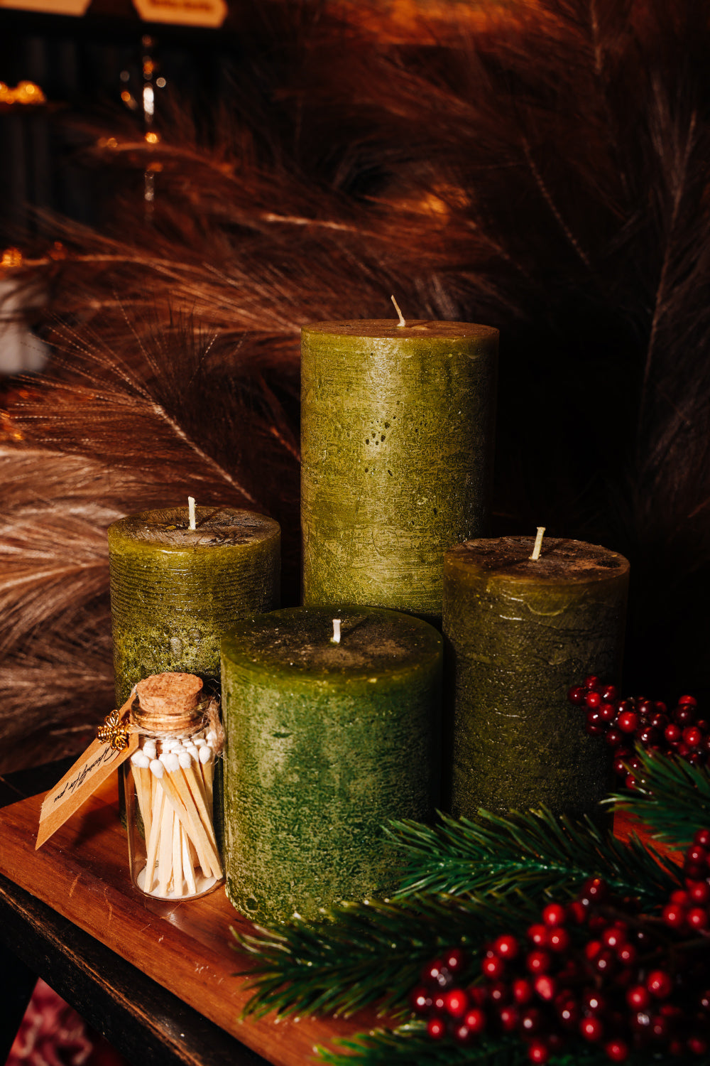 Dabas noskaņu un meža toņu iedvesmots sveču komplekts, kas radīts, lai piešķirtu mājoklim siltumu un mierpilnu ziemas atmosfēru. Četras dažāda augstuma zaļās cilindriskās sveces izskatās harmoniski gan kopā, gan atsevišķi, un veido izteiksmīgu Ziemassvētku dekoru. Roku darbs un kvalitatīvs materiāls nodrošina vienmērīgu liesmu un ilgu degšanas laiku.